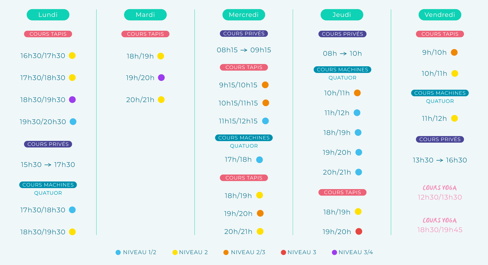 - Chaque élève peut être inscrit sur un créneau horaire précis ou a la possibilité de changer de cours selon son propre planning.