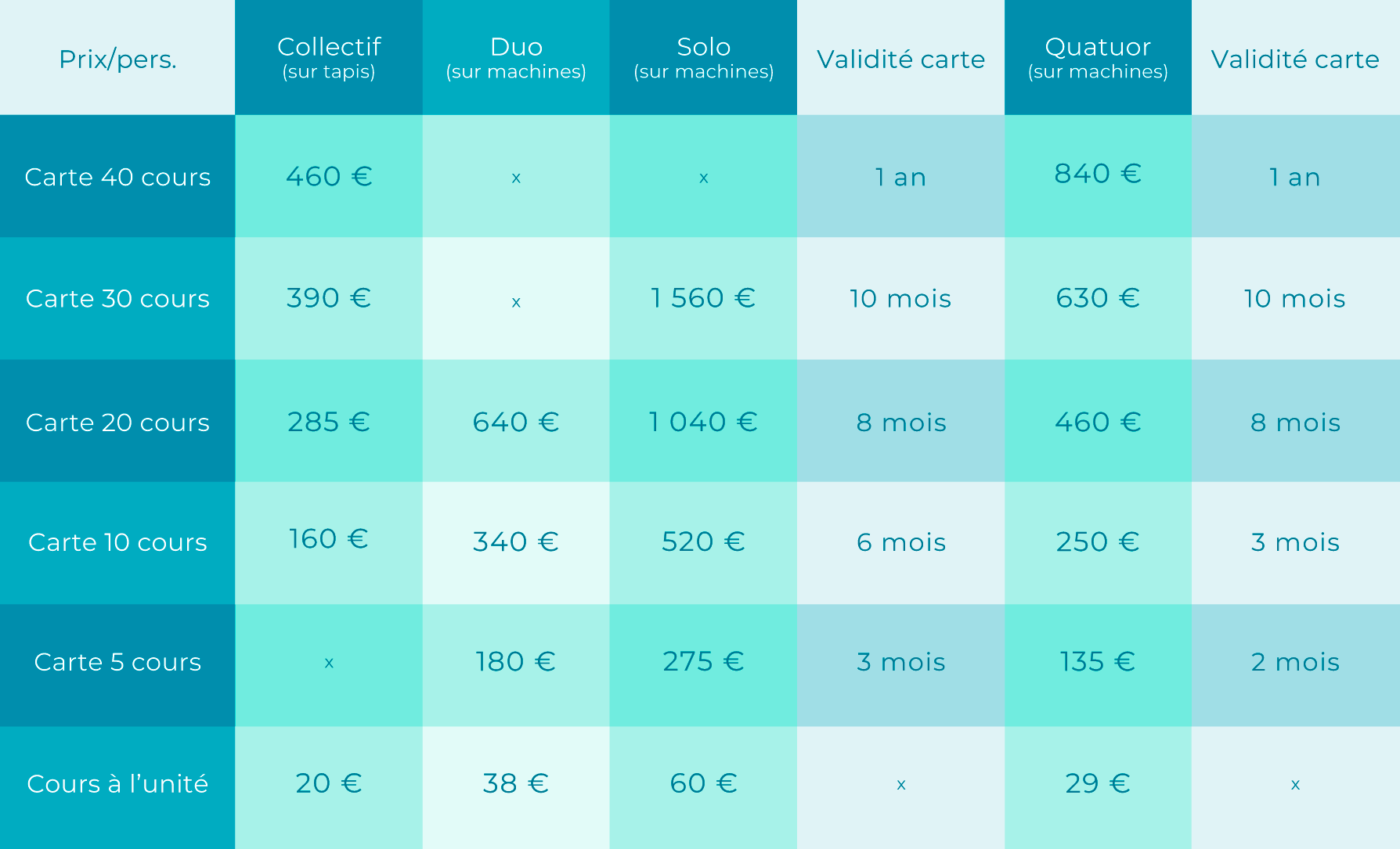 - L’annulation d’un cours se fait au moins 24h à l’avance auprès du professeur faute de quoi il est décompté de la carte.
